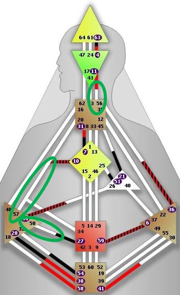 Hier nun gibt es wieder 2 Brückentore, wobei eines für jemanden, der sich noch nicht mit der Human Design Matrix beschäftigt hat, möglicherweise nicht eindeutig ist: