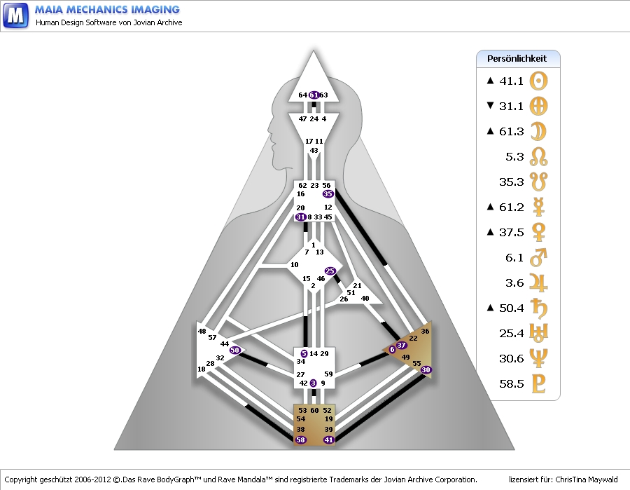 Von der Kehle weg definiert die Erde das Tor 31 = die Einwirkung, mit der Linie 1 = Manifestation, was lt. MMI auch bedeutet „Einfluss kann im Vakuum nicht existieren“ – heißt für mich, dass wir auch in diesem Jahr wieder etwas tun müssen, um etwas be.wirken zu können 😉