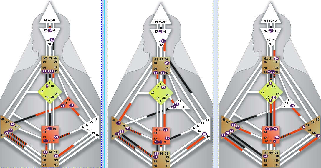 Wie gesagt – die 5 definierten Zentren haben wir alle 3 – und auch die definierte Umsicht nennen wir unser eigen – wir unterscheiden uns nur in EmotionalZentrum und EgoZentrum – und das spielt da jetzt sicher auch mit hinein.