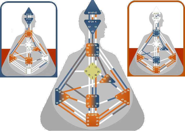 Was ich auch noch spannend fand, ist, dass beim rechten Chart sowohl MilzZentrum als auch EmotionalZentrum offen sind – in der Mitte beide zwar definiert, aber unbewusst und links dann MilzZentrum definiert und EmotionalZentrum offen.