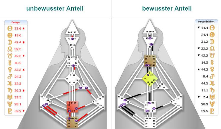 In beiden Fällen weicht das Selbstbild oftmals nachhaltig von dem Bild ab, wie man von anderen Menschen gesehen wird – wieder einmal mein Chart als Anhaltspunkt – diesmal nicht in der Ansicht von 64keys – sondern von MMI der Software des klassischen Human Design System: