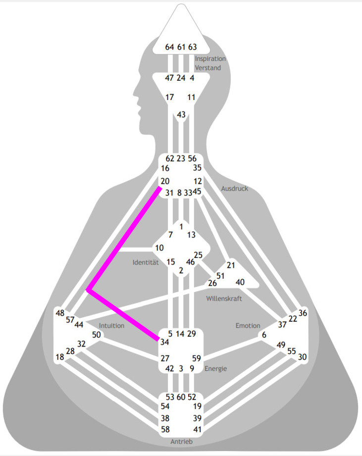 welches mir schnell und effizient diese Verbindung schließt – weil zwischen Selbst und Kehle habe ich ja den Kanal 7-31 – ich brauche also nur eine Verbindung zwischen Sakral und Selbst – das kann jetzt ein anderer Mensch sein – oder auch ein Transit, der dieses Tor aktiviert und mir nen zusätzlichen Boost bringt.