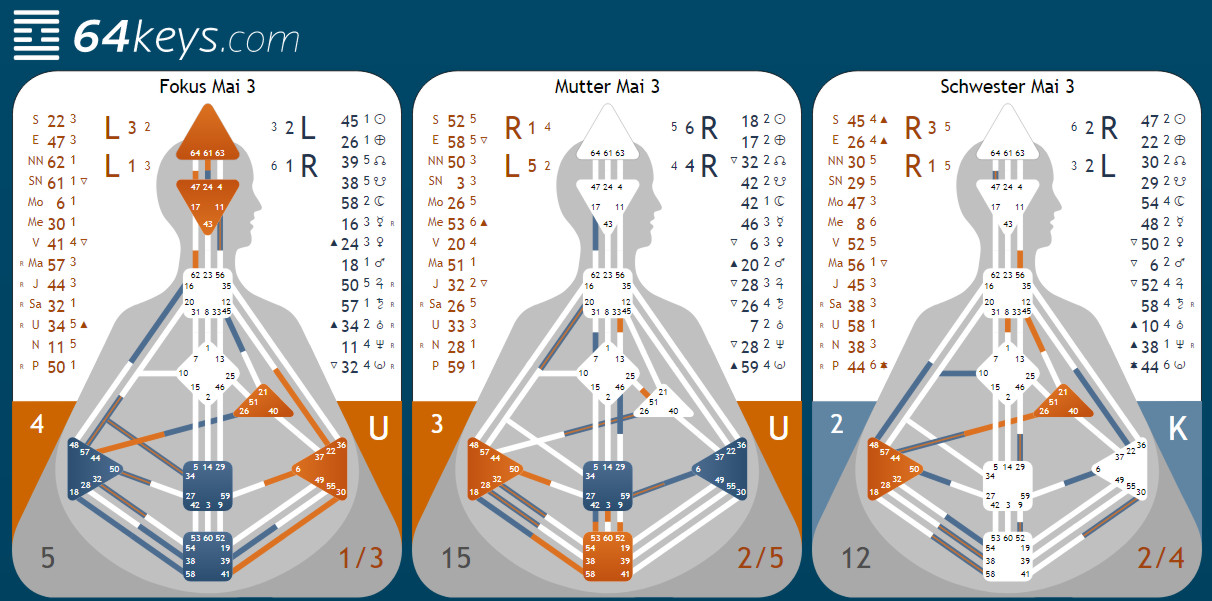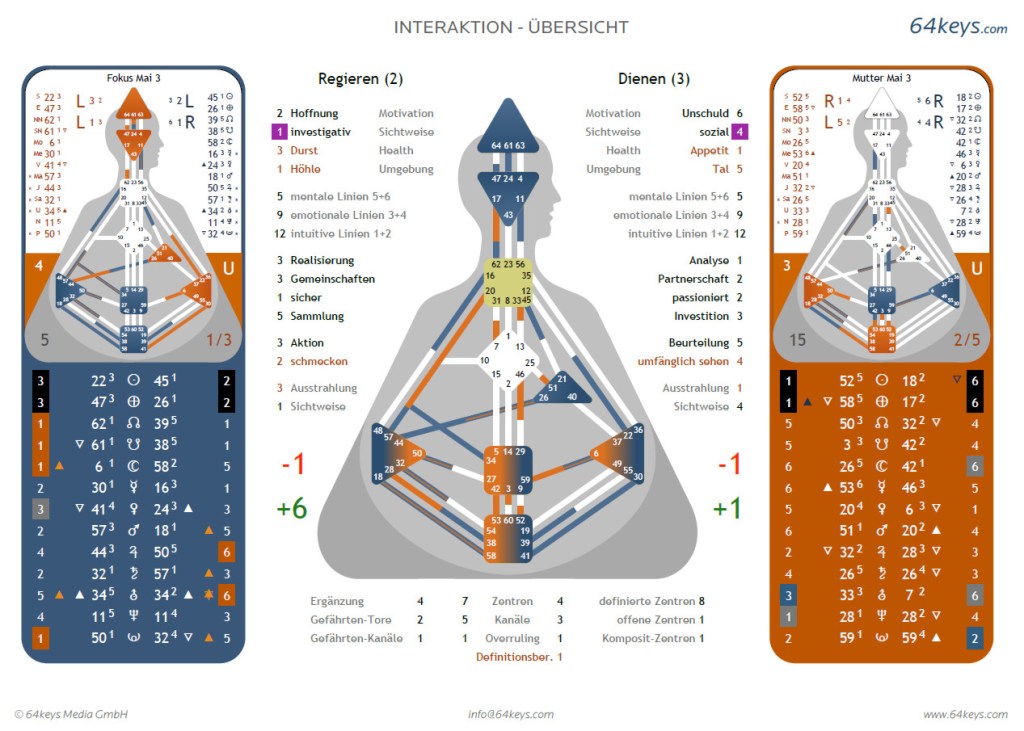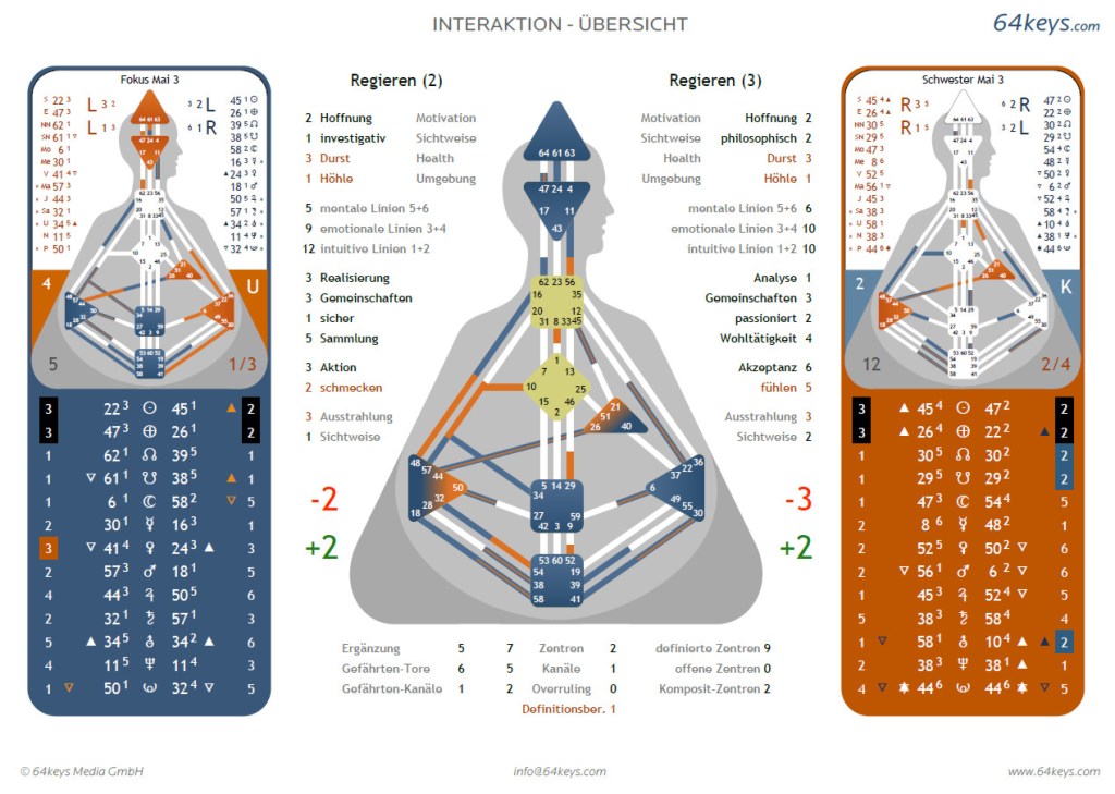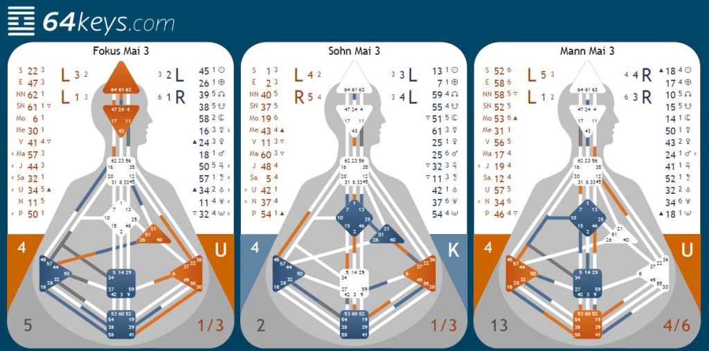 Ansonsten dominiert der Fokus, weil sie nicht nur mehr Zentren definiert hat, sondern auch den Machtkanal – und auch die Emotionen & den Druck der Wurzel & natürlich das SakralZentrum. Was mir auch auffällt, sind die negativen Trigger des Fokus auf die 44 der Schwester – und dass sie sich gegenseitig das Tor 58 triggern: