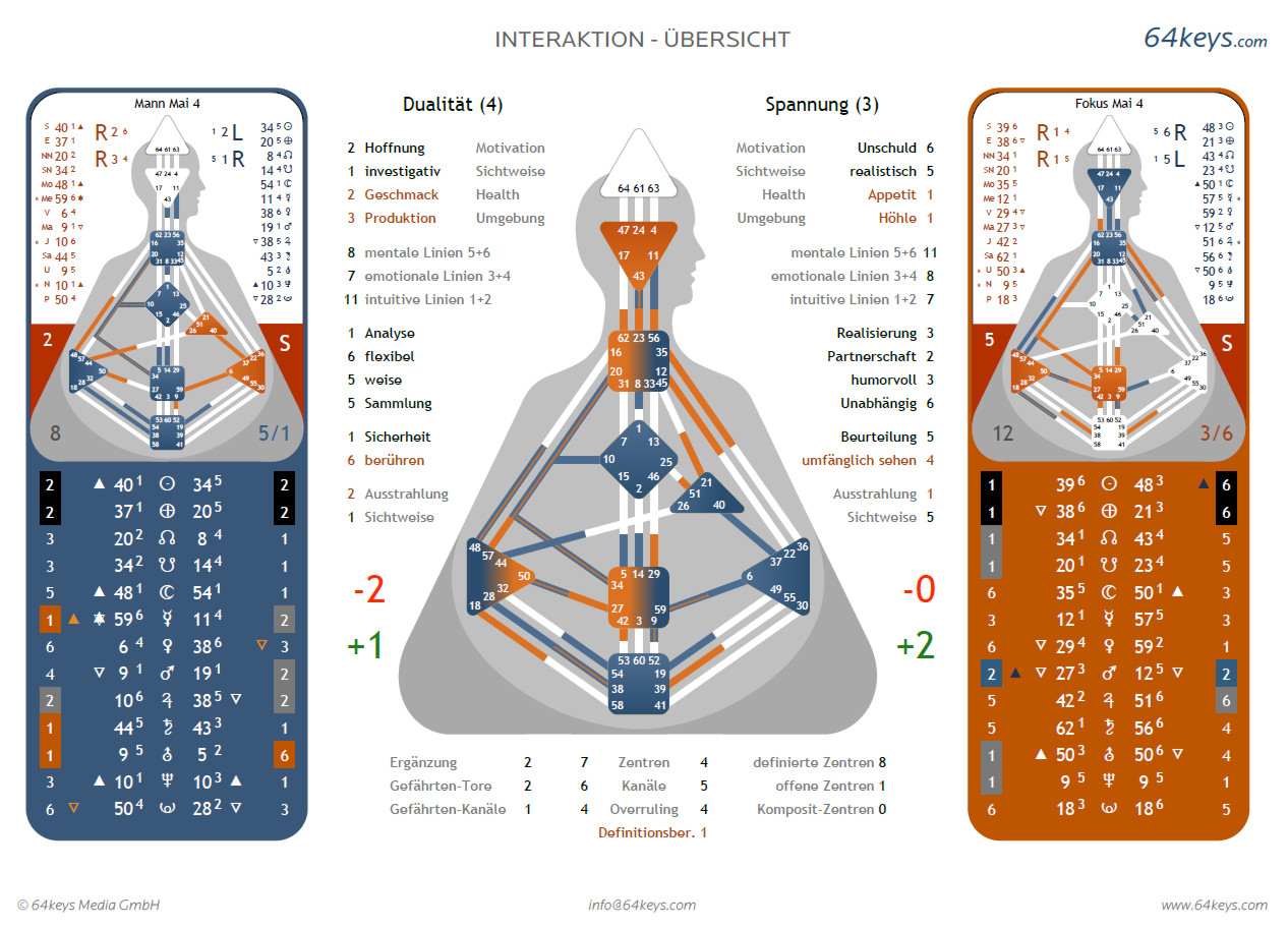 Der Mann hat Emotional- und EgoZentrum definiert – aber unbewusst – das kann bedeuten, dass es da keine gröberen Reibungspunkte gibt mit den beiden offenen Zentren vom Fokus – außer die schon in den vorigen Beispielen erwähnten Thematiken eines offenen EmotionalZentrums, welches fallweise, aber dann nachhaltig, ausrasten kann.