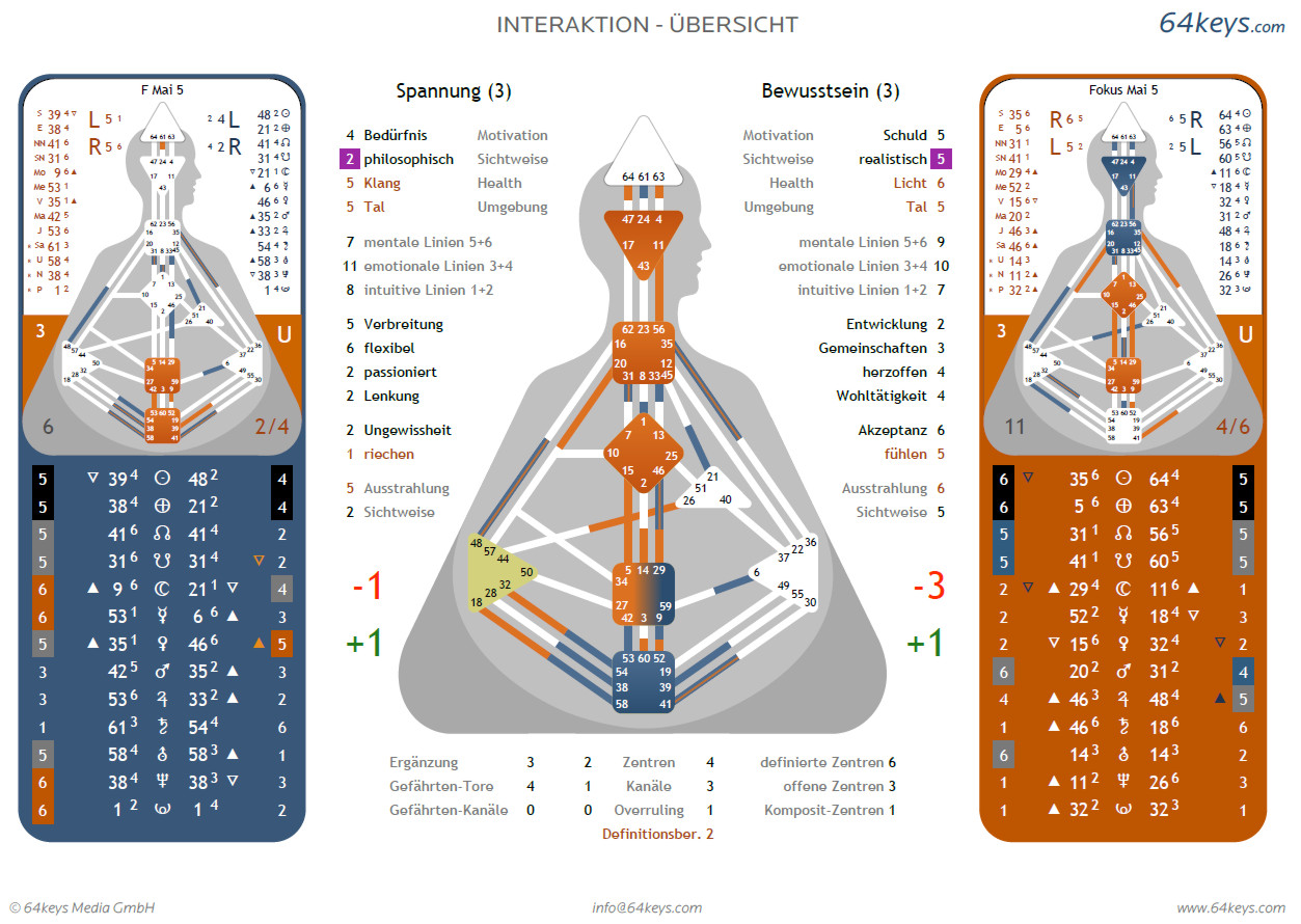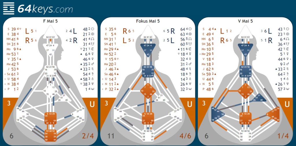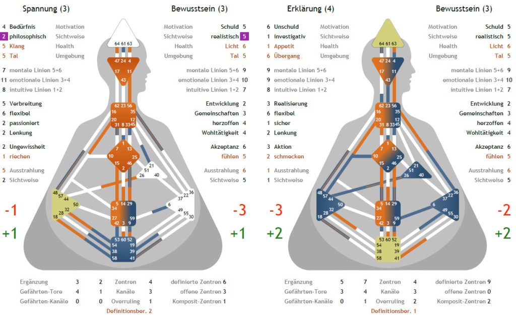 Ich für mich würd jetzt spontan vermuten, dass der Sex mit dem rechten ganz anders ist wie mit dem linken – allein aus der Tatsache, dass er den ganzen Sexkanal (59-6) definiert hat – und der andere „nur“ das Tor 6. Ich lehne mich noch weiter aus dem Fenster – da beim rechten auch das EmotionalZentrum definiert ist, löst er mit ziemlicher Sicherheit „mehr Gefühl“ beim Fokus aus.