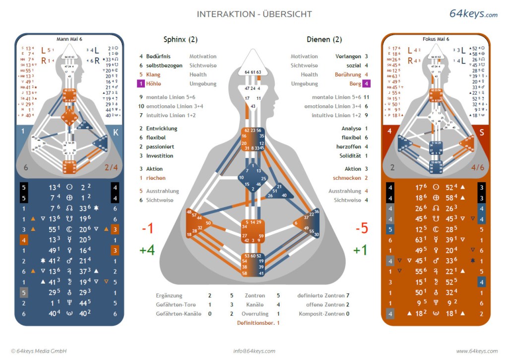 Der Mann hat nen Split, welcher 3 unbewusste und 2 bewusste Zentren definiert – die Frau hat einen Definitionsbereich und auch nur 2 Zentren unbewusst, außerdem natürlich die definierte sakrale Energie, welche von der Wurzel noch zusätzlich gespeist wird.