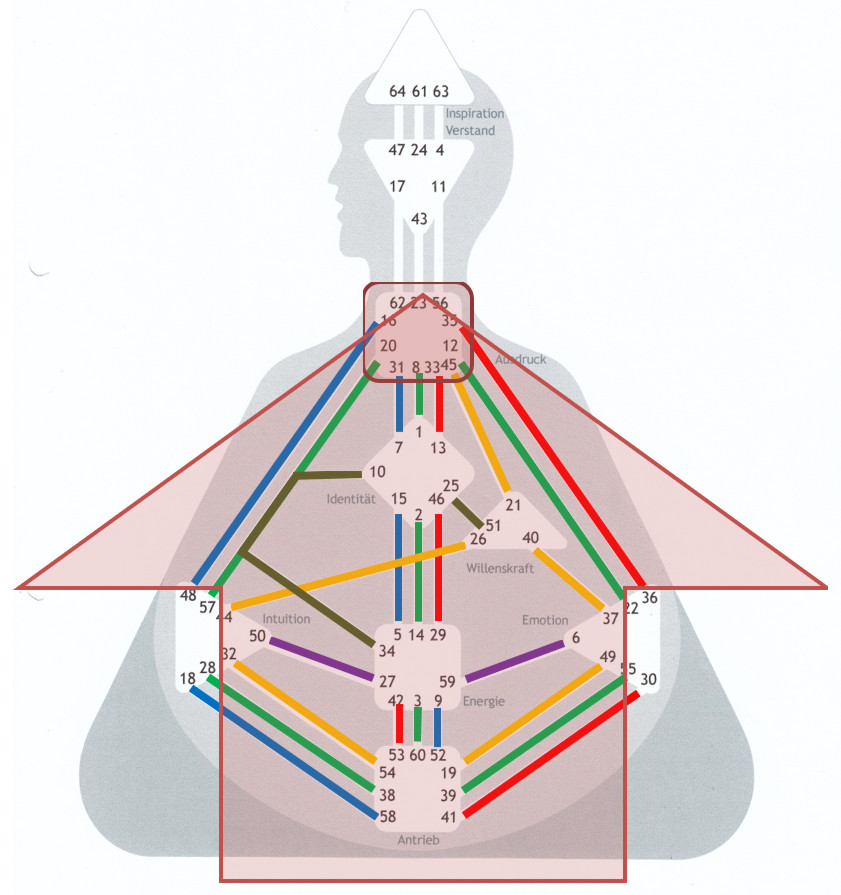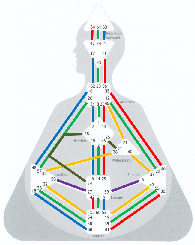 Es wird jetzt selten jemanden geben, die/der wirklich einen ganzen Schaltkreis durchgehend definiert hat – aber je mehr definierte Tore und Kanäle und Zentren auf dem Weg vom WurzelZentrum zum KehlZentrum – oder vom KopfZentrum zum KehlZentren – in einem bestimmten Schaltkreis definiert sind, desto mehr geht es bei allem, was wir tun – um die Thematiken der Überbegriffe des jeweiligen Schaltkreises.