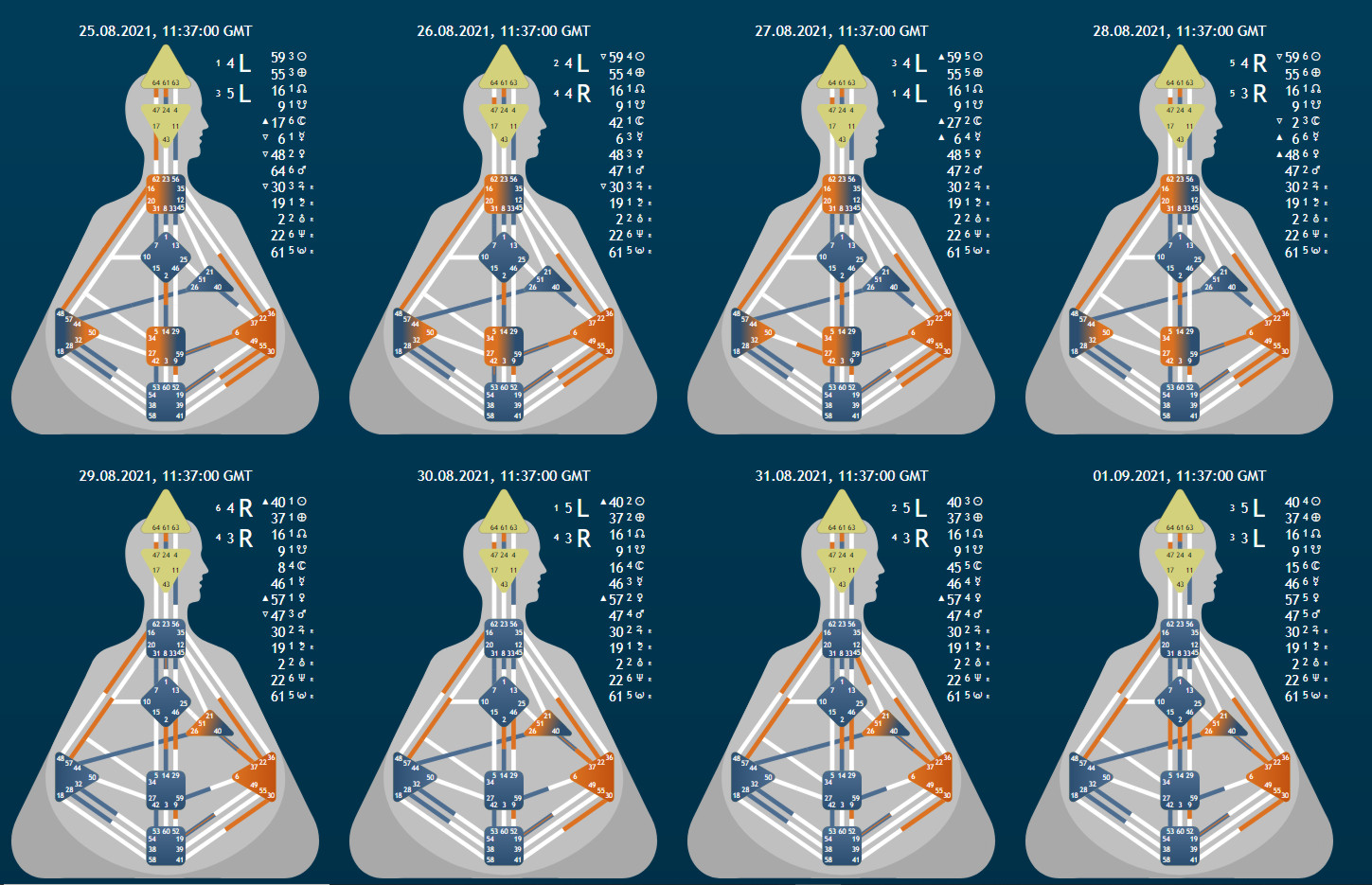 Ich hatte nicht geschrieben, dass sie nur mit den bewussten Hexagrammen im eigenen Chart interagieren, sondern, dass BEI DEN TRANSITEN nur die rechten = bewussten Definitionen wirken.
