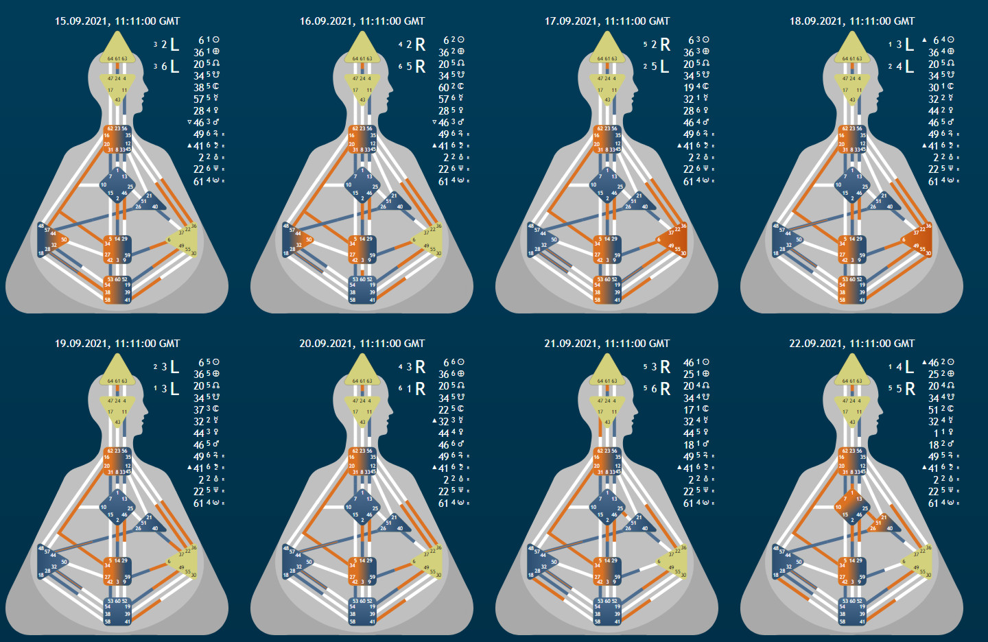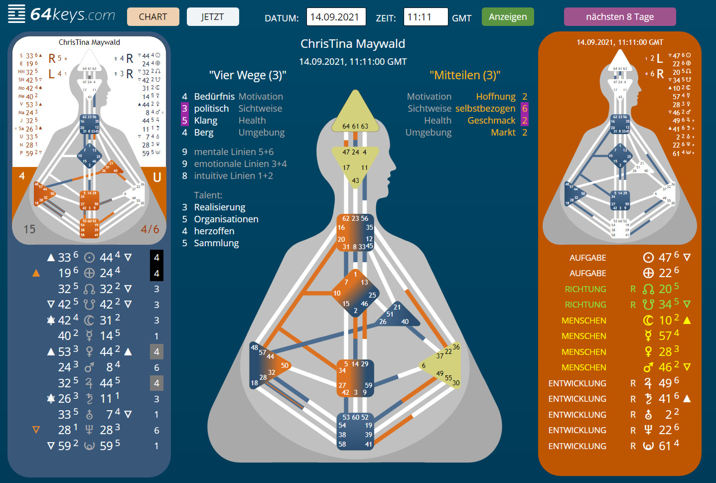 Hier noch die Übersicht über 8 Tage – beginnend vom Zeitpunkt der Veröffentlichung dieses Beitrags – das, was orange ist, sind hierbei nicht deine unbewussten Definitionen – siehe voriges Bild – sondern die Transite – alles, was blau ist, ist meine gesamte Veranlagung – ich wollts nur dazu schreiben, bevor es wieder zu Mistverständnissen kommt 😉