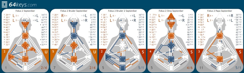 Es kann durchaus sein, dass der Vater sich in Anwesenheit von Fokus 2 anders fühlt als wenn der ältere der Brüder bei ihm ist – weil beide ihre eigene Sichtweise auf ihren Vater haben – und durch dessen offenes G-Zentrum = Selbst da möglicherweise Schwankungen auftreten.