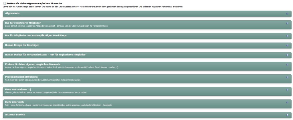 Also nicht wundern, wenn du weniger Kategorien angezeigt bekommst – liegt an deinem Status – und wenn es überhaupt anders aussieht, liegt es daran, dass ich auf diesem Bild die Anzeige der einzelnen Foren eingeklappt habe – einfach auf den grünen Bereich klicken, klappt es ein – bzw. auch wieder aus 😉