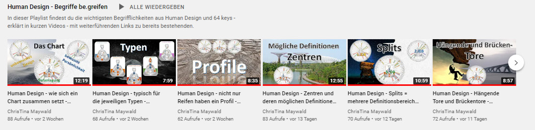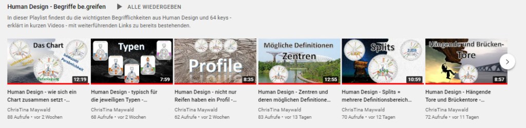 Für diese Playlist habe ich mich bemüht etwas kürzere Videos zu drehen – zu unterschiedlichsten Thematiken, wo es jetzt eher um die Begrifflichkeiten aus Human Design geht – folgende Themen findest du in der Playlist: