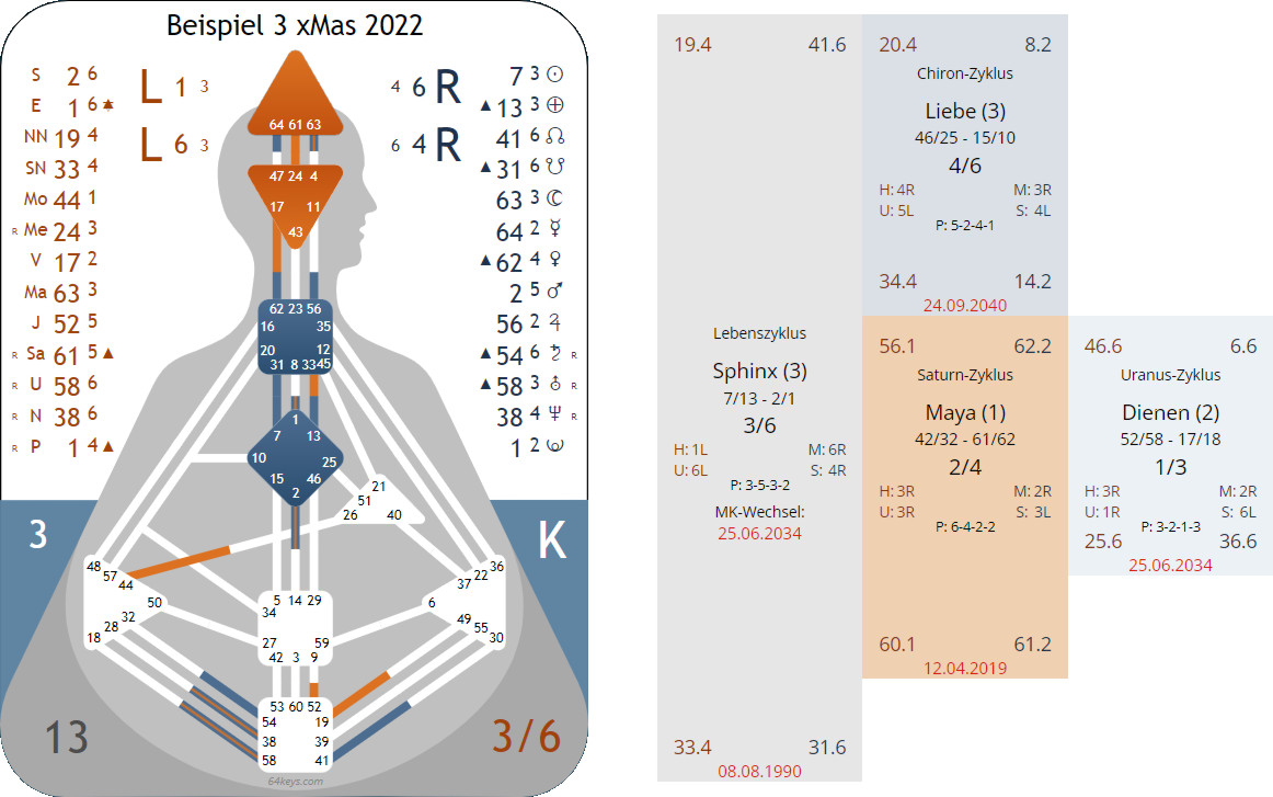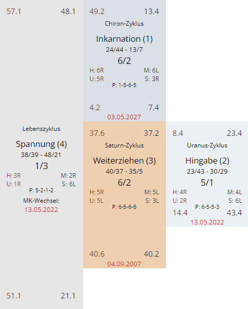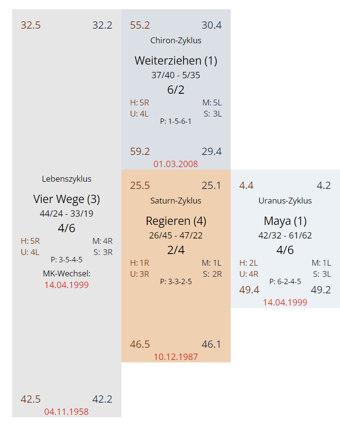 Wir haben überall die Linie 4 drinnen – im ursprünglichen im unbewussten Design – und durch Saturn Return und Uranus Opposition dann in der bewussten Persönlichkeit – es ändert sich jetzt also in Bezug zum Profil nichts gegenüber dem vorigen Zyklus – es wird nur noch verstärkt und/oder verlängert – um dann mit dem Chiron wieder zum ursprügnlichen zurück zu kehren.