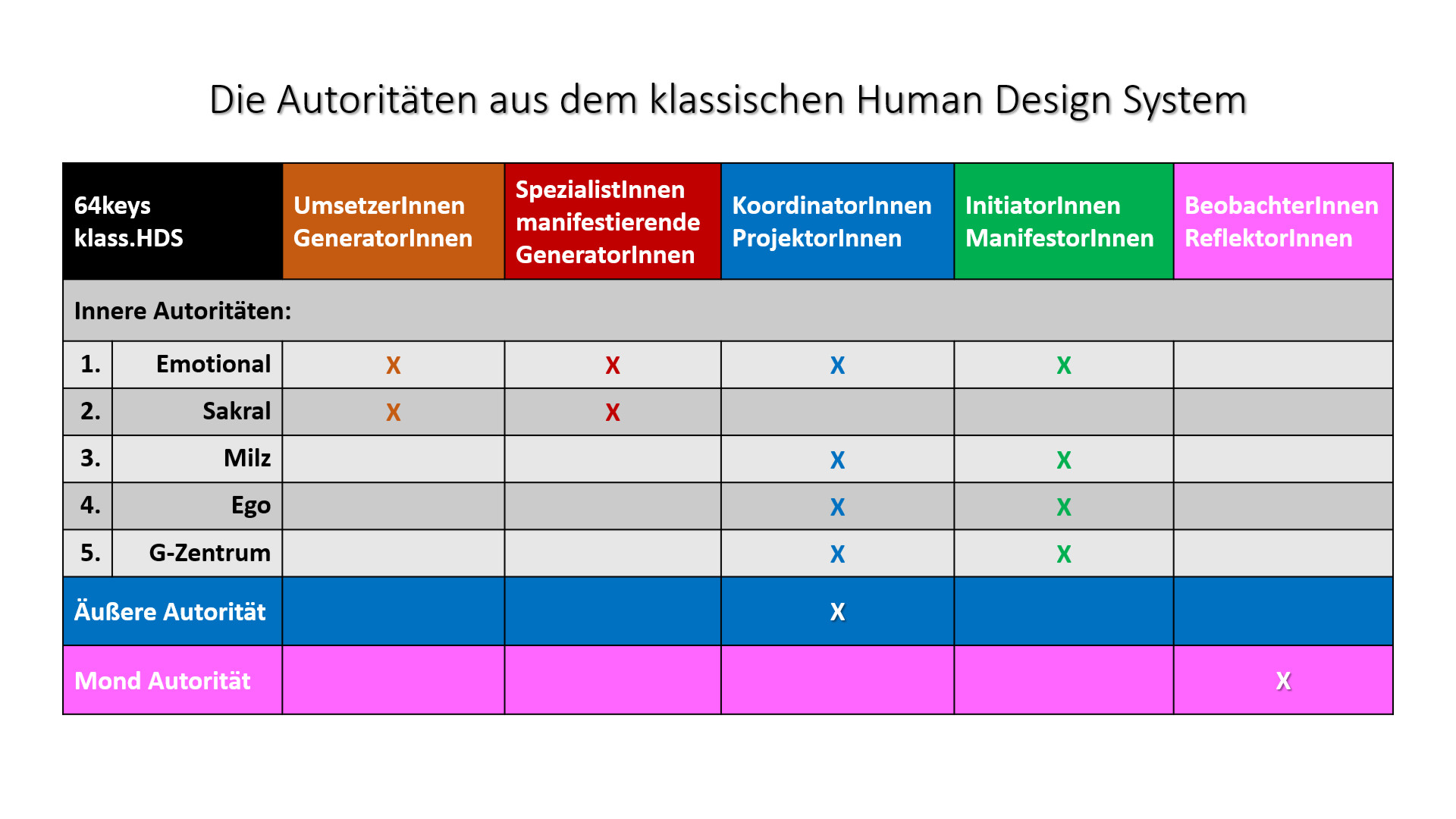 - Emotionale Autorität ==> kann es bei allen Typen geben – uasser bei den BeobachterInnen = ReflektorInnen