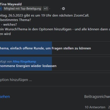 Nachdem im letzten Call der Wunsch geäußert wurde, dass wir uns bei den nächsten Calls mit bestimmten Themen beschäftigen – habe ich in der Facebook Gruppe eine entsprechende Umfrage gestartet – am Freitag, 19.5.2023 zu Mittag: Am Sonntag, 21.5.2023 kurz nach Mitternacht hab ich dann noch nachgefragt, was genau die, welche die zusätzliche Option angeklickt … Mehr Nächster Zoom Call am 26.5.2023 um 19:00 Uhr