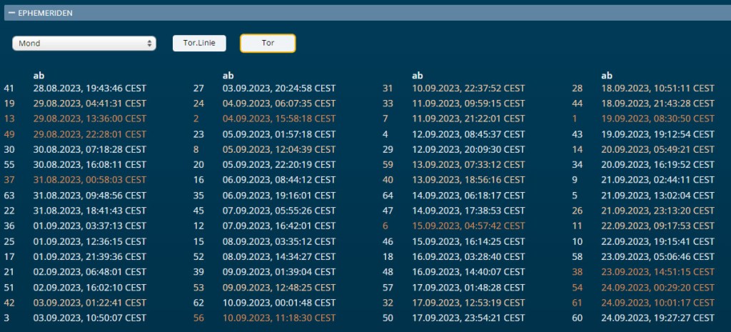 Und speziell für BeobachterInnen = Reflektor ist der Mond wichtig, weil der innerhalb von 28 Tage das gesamte Rad der Hexagramme durchläuft – hier als Beispiel die Ephemeriden der nächsten Tage und Wochen.