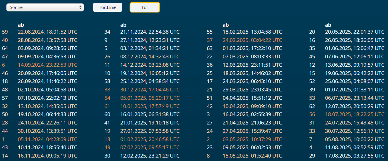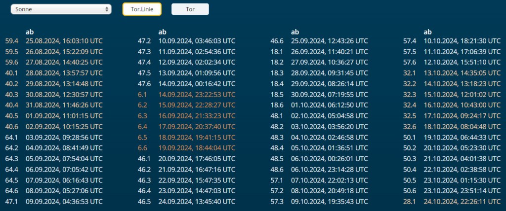 und die Linien wechseln ca. alle 5,7 Tage – wenn wirs weiter runter brechen kommen wir auf 0,95 Tage pro Farbe und 0,19 Tage pro Ton