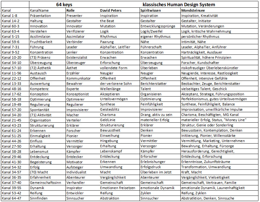 Jedes der 64 Tore entspricht einer Qualität, und wenn zwei Tore verbunden sind, verschmelzen ihre Eigenschaften zu einer einzigartigen Energie. Siehe dazu auch: