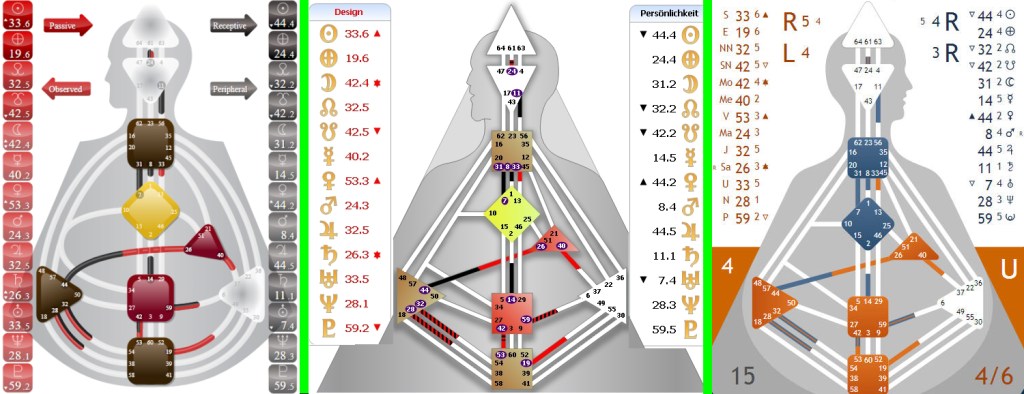 Und es ist dann auch noch eine eventuelle Unterschiedlichkeit zwischen unbewusstem Design und bewusster Persönlichkeit, sowie dann eben im endgültigen Chart zusätzlich zu berücksichtigen. Letztendlich zeigt uns die Human Design Matrix sozusagen das große Ziel, wohin wir uns ent.wickeln könn(t)en, wenn wir es denn woll(t)en.