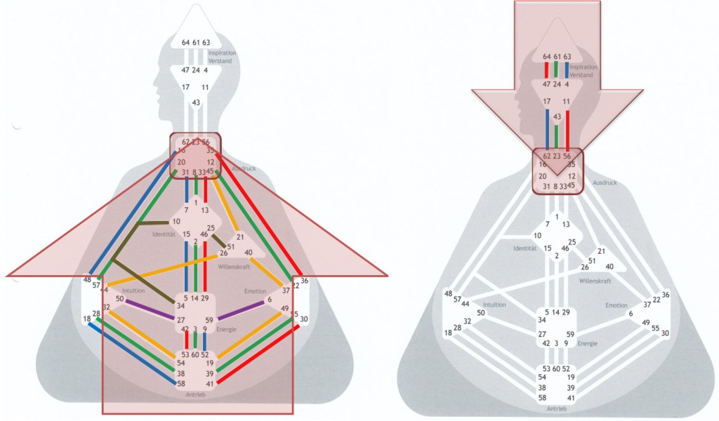Außerdem sind sämtliche Aussagen dann auch noch im Zusammenhang mit der jeweiligen Körpergrafik zu betrachten, weil eben nicht jedes definierte Tor bei jedem Menschen gleich ausgeprägt ist – eben auf Grund von Farben und Tönen und Basen – sondern dann auch noch unterschiedlich gelebt wird.
