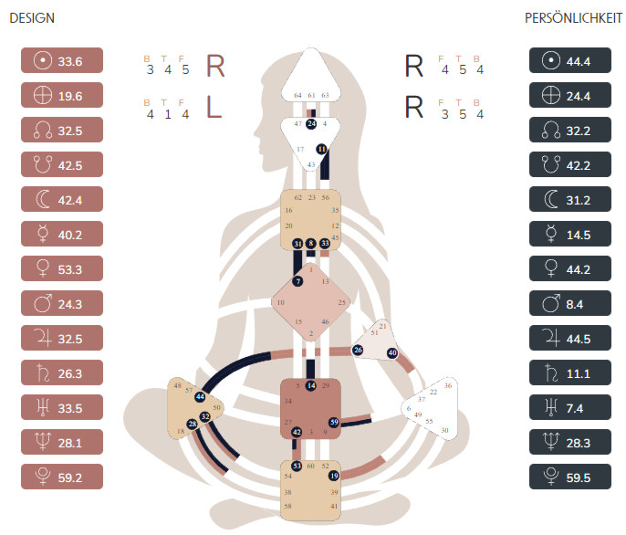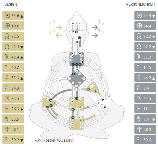 sind. Verbunden sind die Zentren mit sogenannten Kanälen, welche sich wieder aus jeweils 2 Toren bilden. Welche Tore definiert sind, leitet sich aus den Geburtsdaten ab.