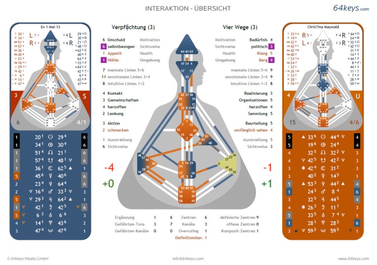 Interaktionen beziehen sich auf die energetische Verbindung zwischen zwei Menschen. Immer wenn zwei Charts aufeinandertreffen, entsteht ein sogenanntes Komposit Chart (= in der Software von 64 keys das in der Mitte) – das zeigt, wie sich die beiden Energien gegenseitig beeinflussen.