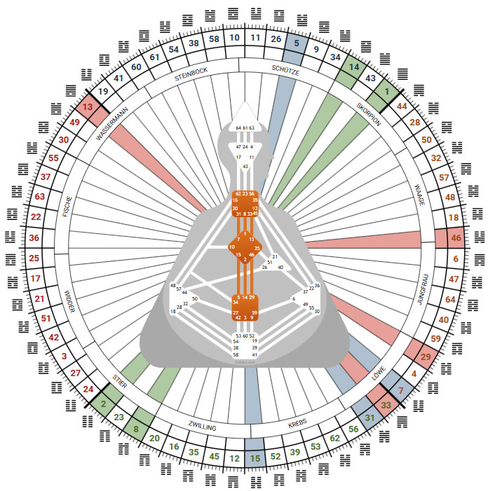 Im Gegensatz dazu schau auch auf den Kanal 53-42 = links zwischen WurzelZentrum und SakralZentrum – in dem Fall hab ich den ganzen Kanal – und daher „überrolle“ ich sein einzelnes Tor – wird auch als „overruling“ in der Legende bezeichnet.