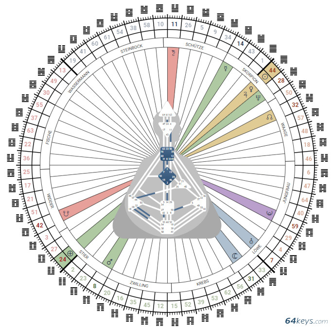Weil wir alle mit der Matrix arbeiten – sei es im klassischen Human Design System – oder auch bei 64 keys – und auch bei allen anderen Systemen, die mittlerweile auf dem Markt sind – die Basis ist immer die gleiche – das Rad der Hexagramme, welche uns aufzeigt, welche Themen = Tore = Hexagramme des I-Ging fest gelegt wurden.