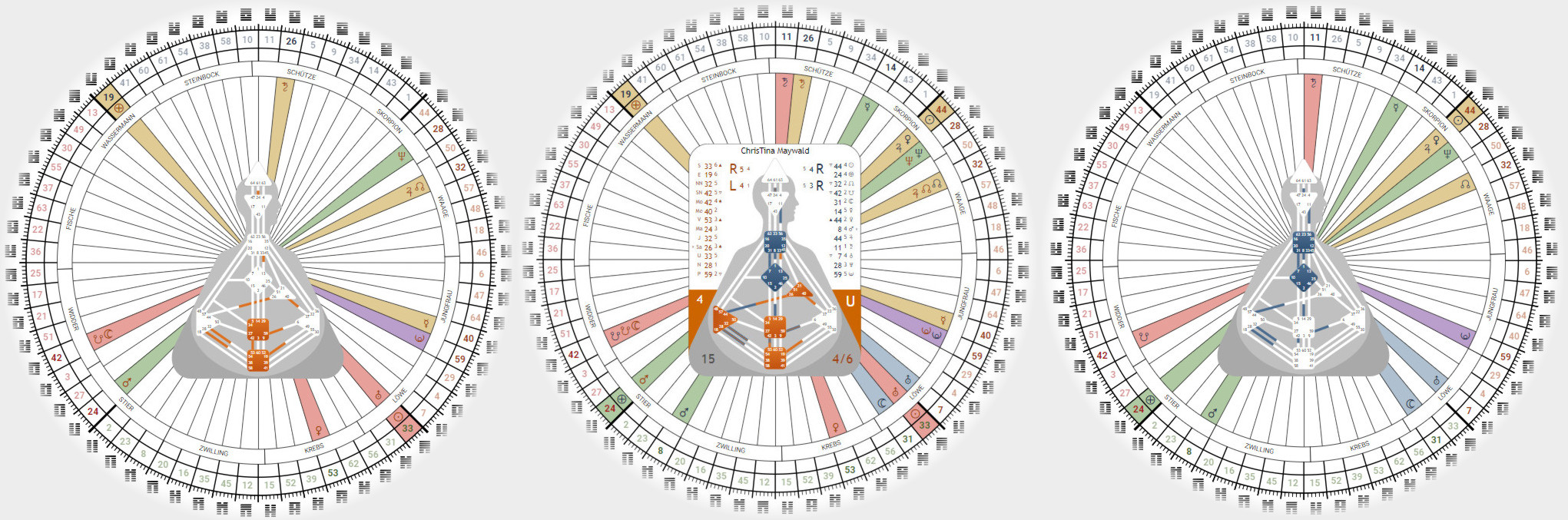 Ich persönlich arbeite mit der Software von 64keys – die Darstellung weicht farblich vom klassischen Human Design System ab – auch manche Bezeichnungen sind etwas anders als im klassischen Human Design System – und auch bei anderen Systemen.